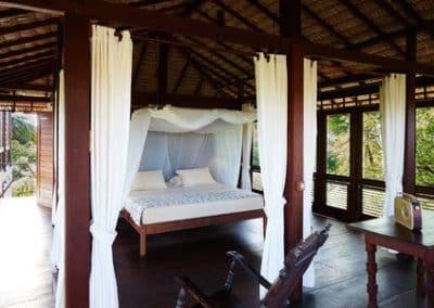 Construits sur un terrain vallonné et arboré de deux hectares, les neuf chalets sont fabriqués à partir de matériaux traditionnels de la région. Ils sont naturellement ventilés (pas de climatiseur) et séparés par de grands espaces de verdure. Le “Chalet des Arbres” dispose d’une très grande terrasse qui surplombe les arbres, de trois chambres et d’une tour depuis laquelle vous pouvez admirer la plage et les premières dunes du Parc.